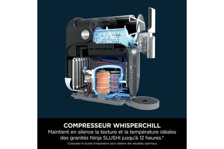 Le Ninja SLUSHi est équipé d'un compresseur WhisperChill, qui maintient vos boissons à la température et à la texture glacées parfaites de manière silencieuse, sans perturber la fête ou vous déranger pendant vos moments de relaxion.